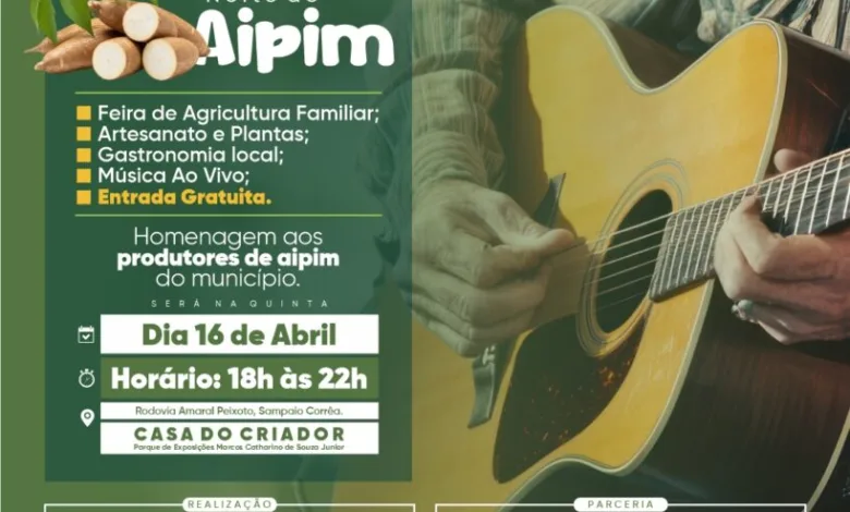 A programação contará com feira de agricultura familiar, exposição e venda de artesanato e plantas, além de uma variada gastronomia local, com destaque para pratos à base de aipim. O público também poderá aproveitar apresentações de música ao vivo, em um ambiente que celebra as tradições do campo.