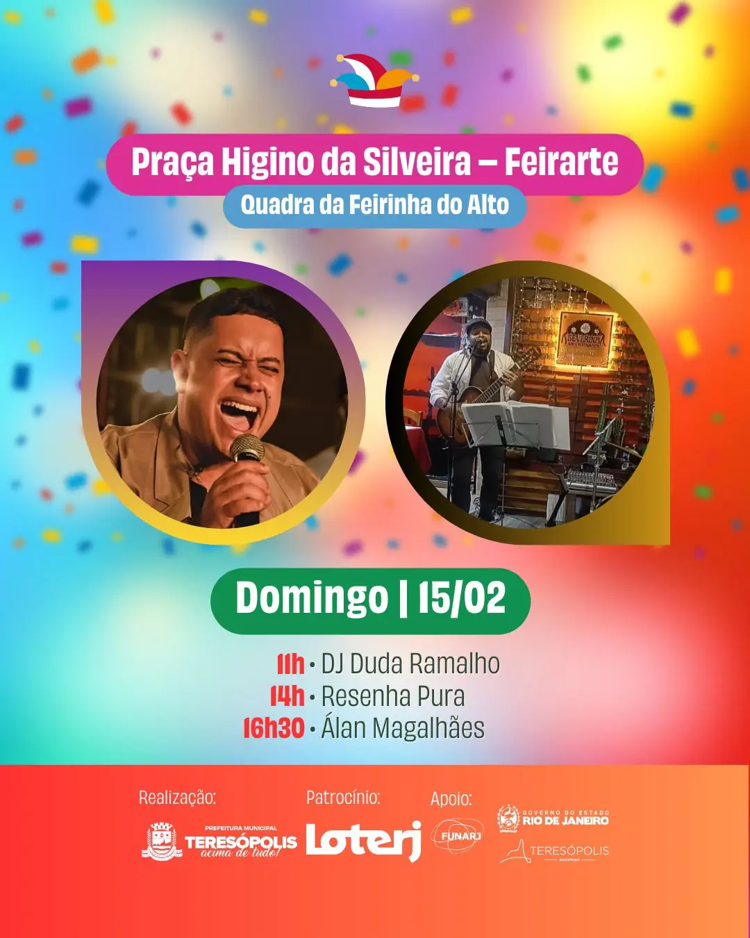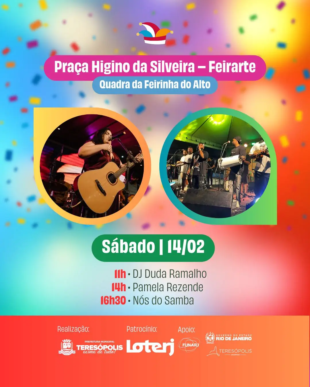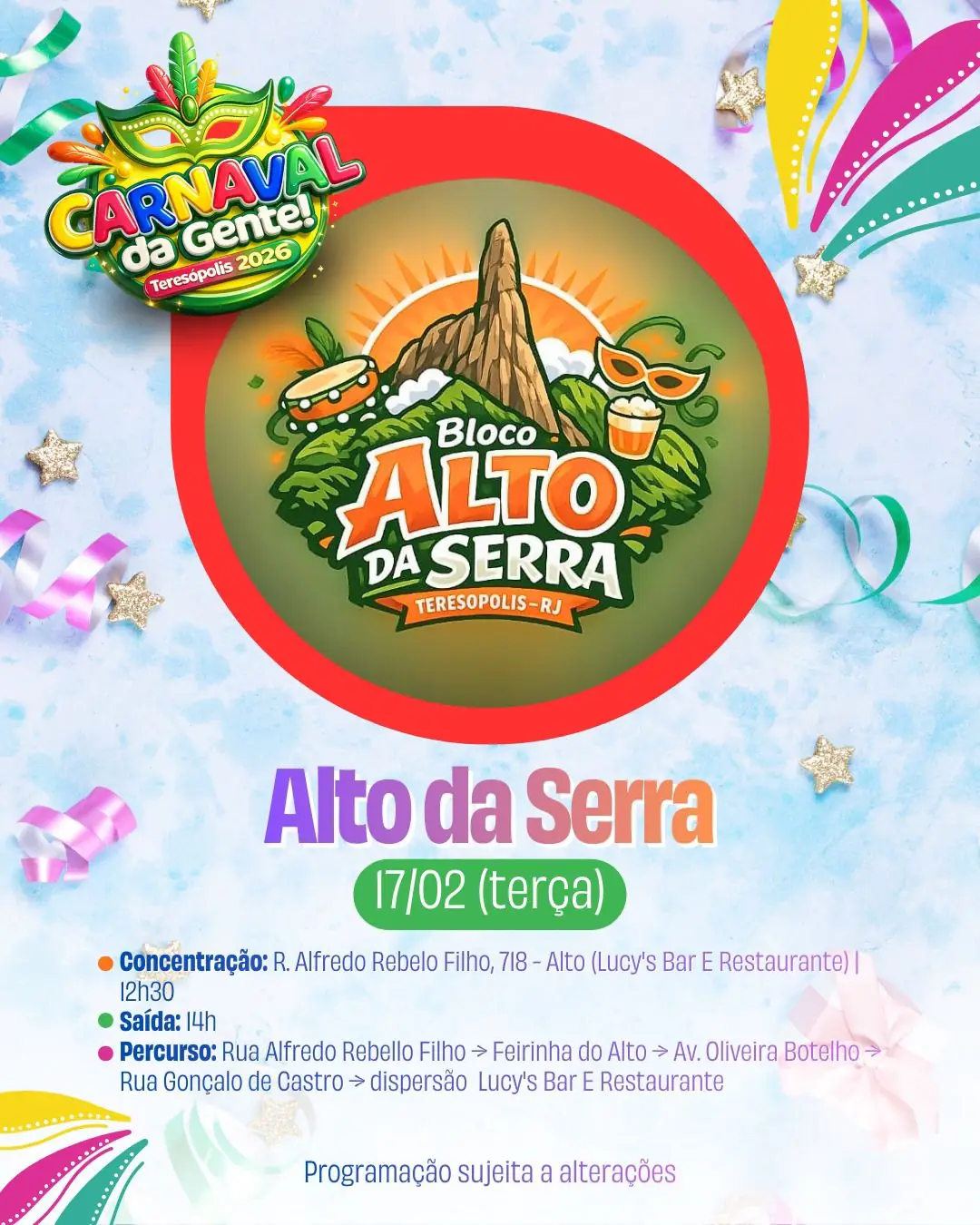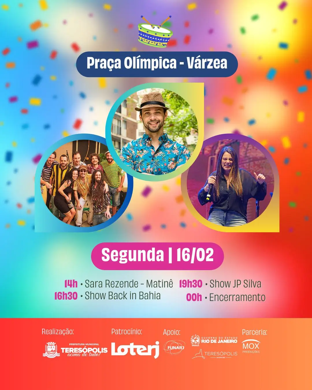 Serão cinco dias de programação intensa, distribuída por importantes espaços do município. As atrações acontecem na Feirinha do Alto (Praça Higino da Silveira), na Praça Olímpica Luís de Camões, na Várzea; na Praça Nilo Peçanha, no Alto, ao lado do Colégio Ginda Bloch; e também no interior, em Bonsucesso, no 3º Distrito. Com shows de artistas locais e desfiles de blocos que prometem colorir ruas e avenidas, o Carnaval teresopolitano reforça sua vocação como uma festa democrática, segura e repleta de energia positiva.