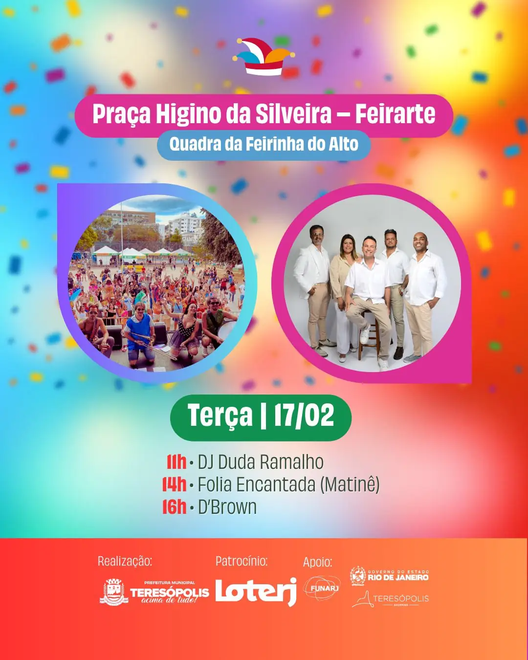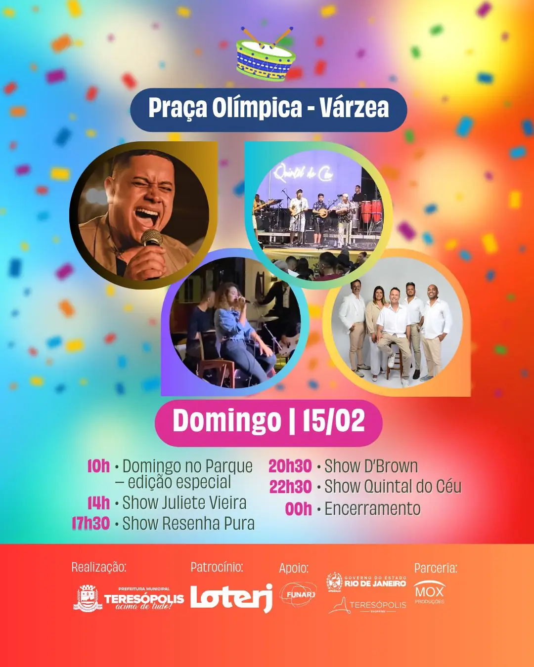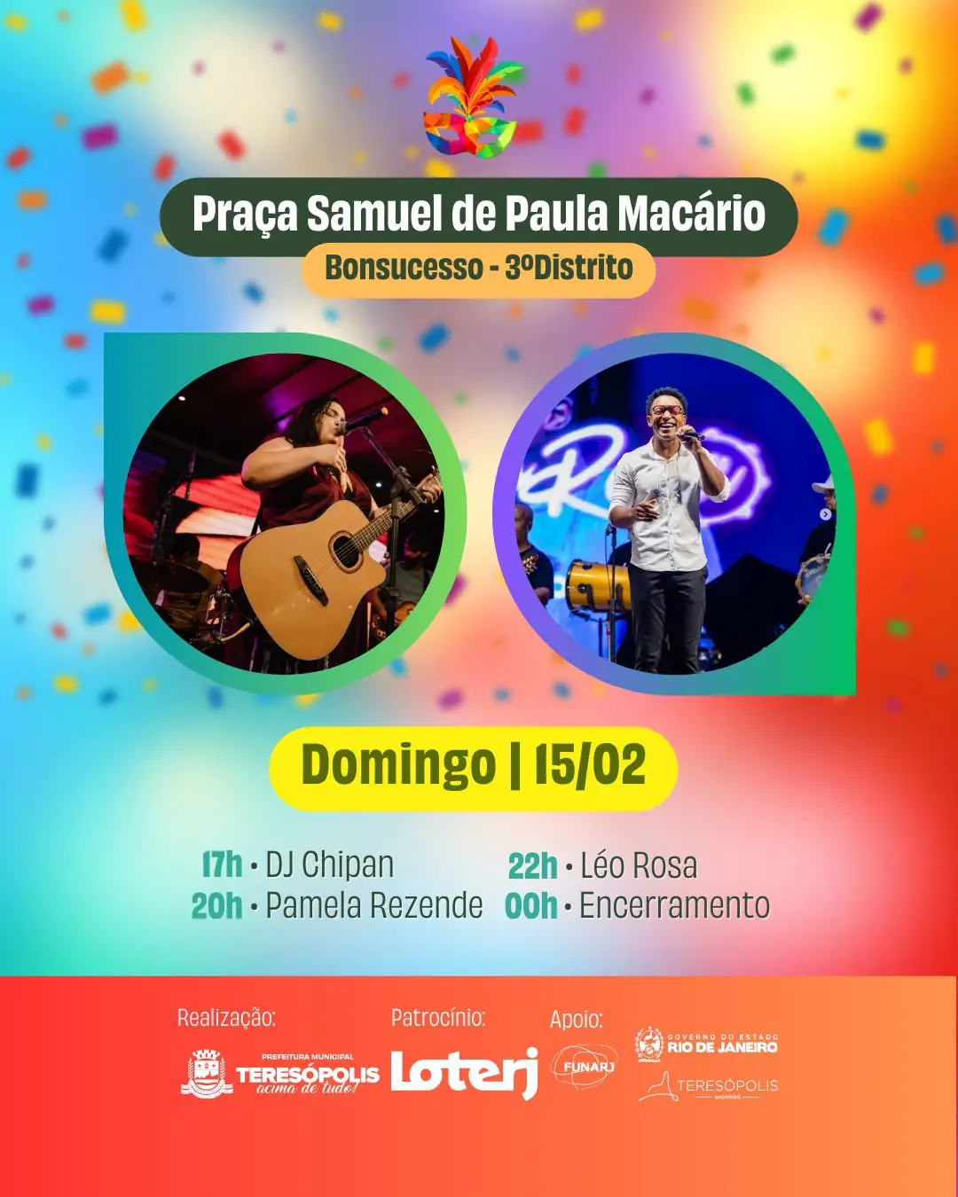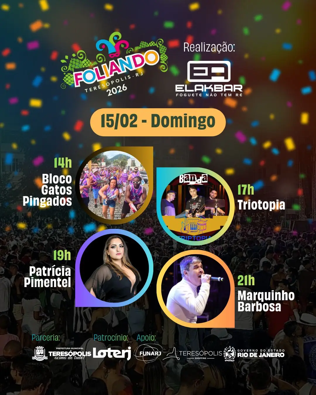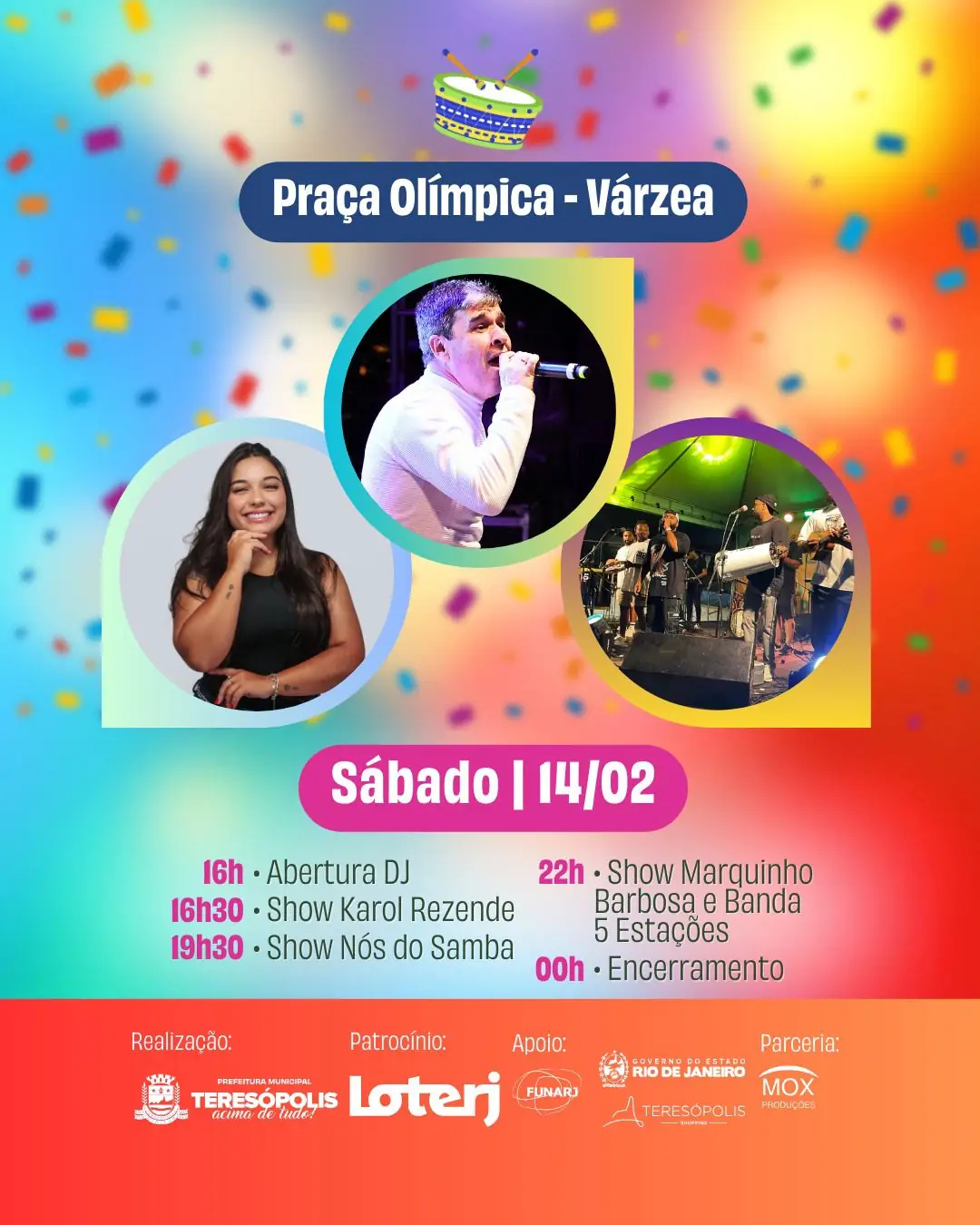 Serão cinco dias de programação intensa, distribuída por importantes espaços do município. As atrações acontecem na Feirinha do Alto (Praça Higino da Silveira), na Praça Olímpica Luís de Camões, na Várzea; na Praça Nilo Peçanha, no Alto, ao lado do Colégio Ginda Bloch; e também no interior, em Bonsucesso, no 3º Distrito. Com shows de artistas locais e desfiles de blocos que prometem colorir ruas e avenidas, o Carnaval teresopolitano reforça sua vocação como uma festa democrática, segura e repleta de energia positiva.