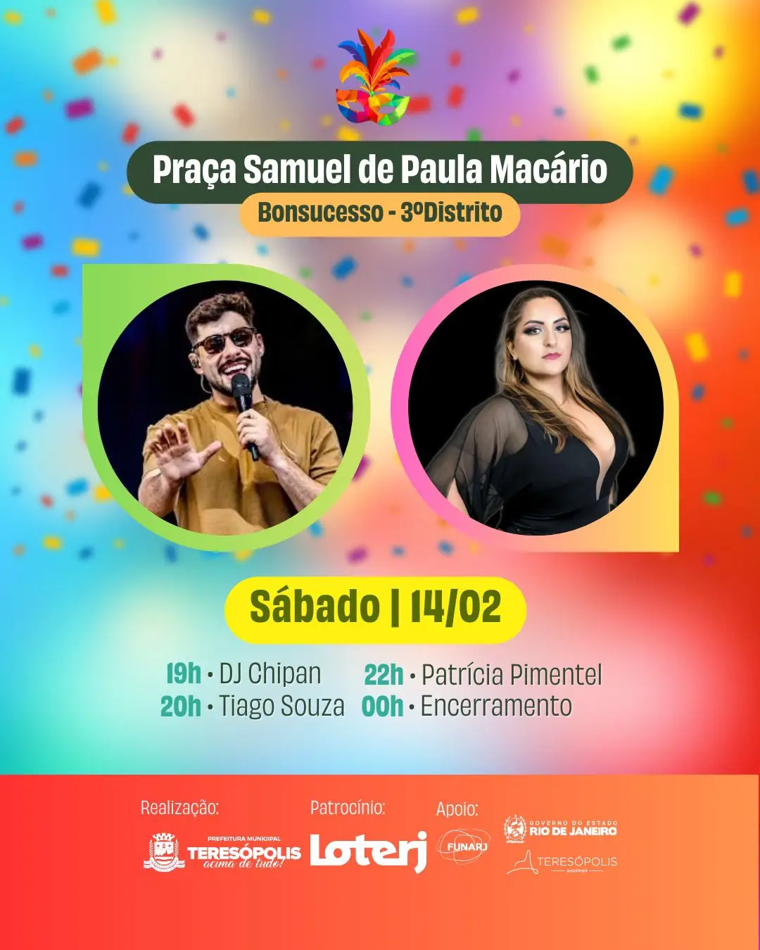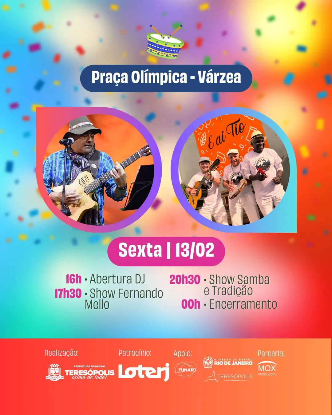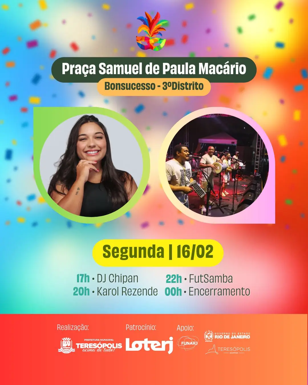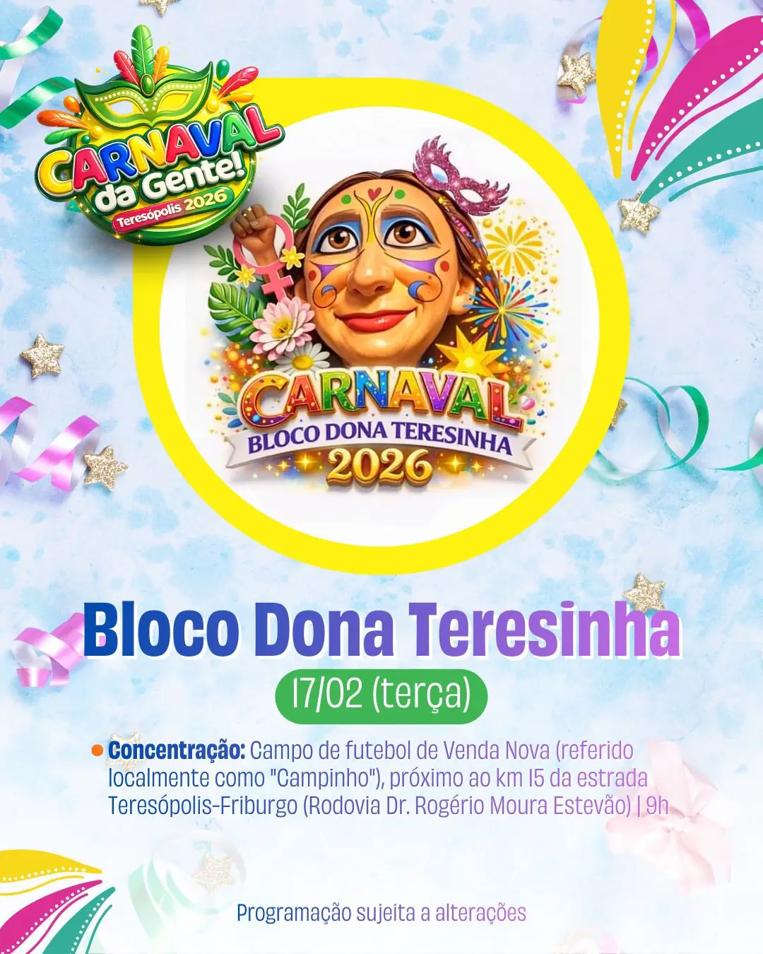 Serão cinco dias de programação intensa, distribuída por importantes espaços do município. As atrações acontecem na Feirinha do Alto (Praça Higino da Silveira), na Praça Olímpica Luís de Camões, na Várzea; na Praça Nilo Peçanha, no Alto, ao lado do Colégio Ginda Bloch; e também no interior, em Bonsucesso, no 3º Distrito. Com shows de artistas locais e desfiles de blocos que prometem colorir ruas e avenidas, o Carnaval teresopolitano reforça sua vocação como uma festa democrática, segura e repleta de energia positiva.