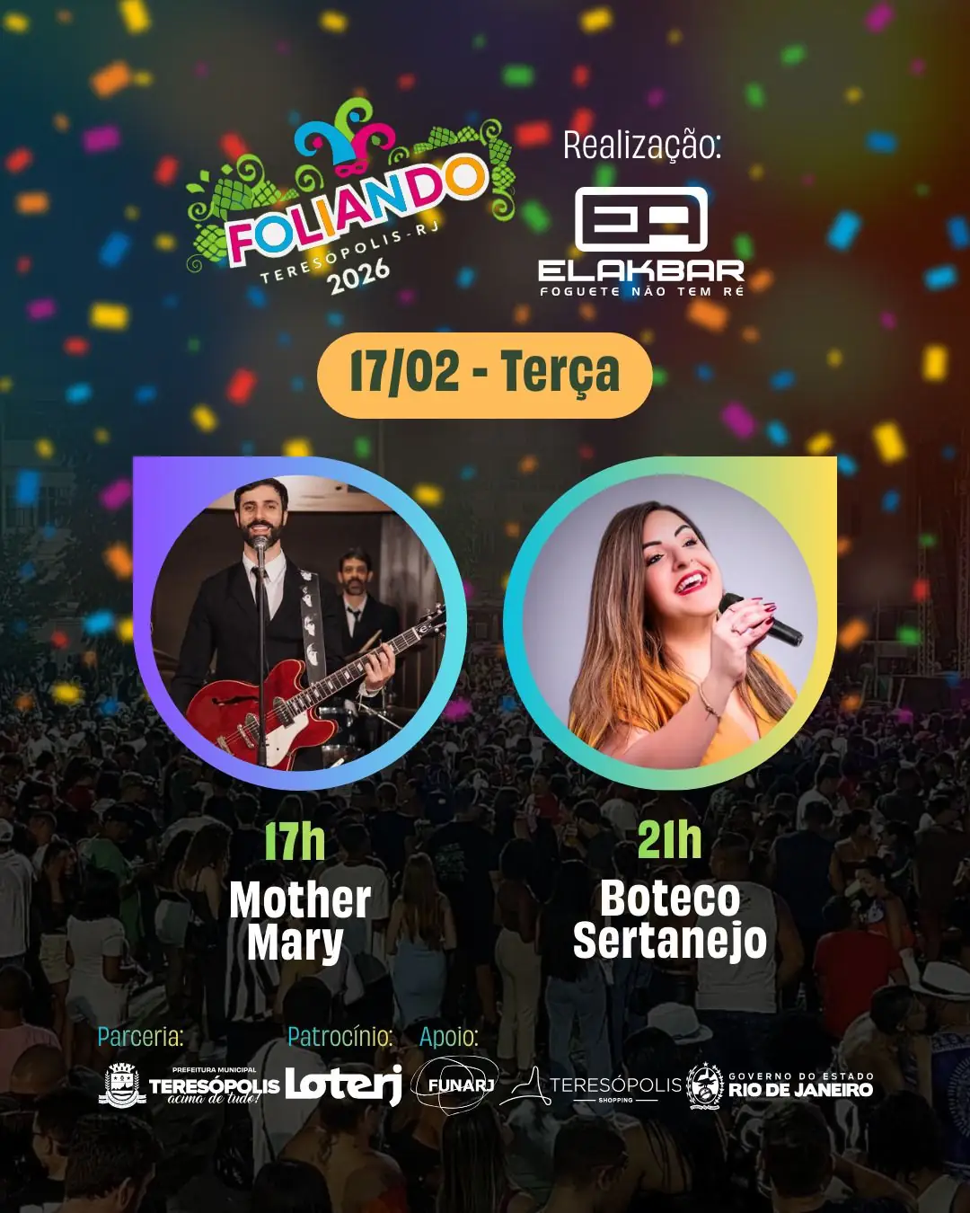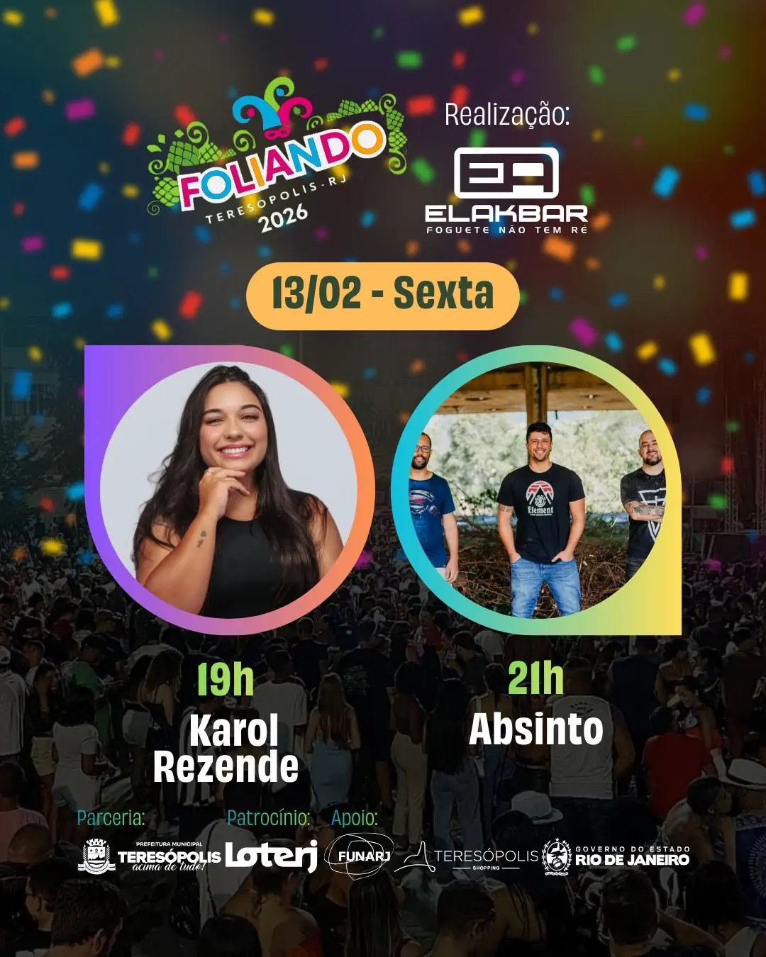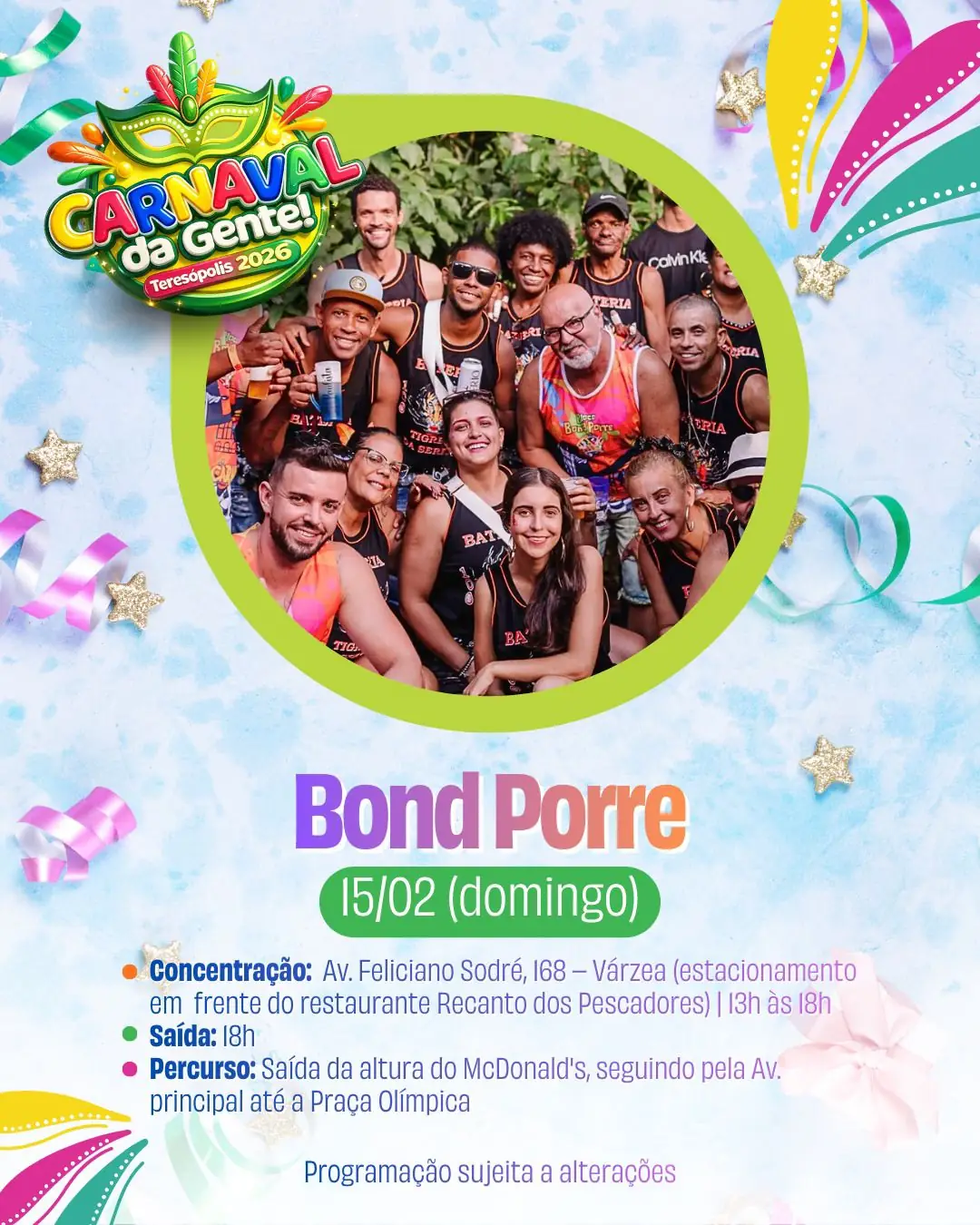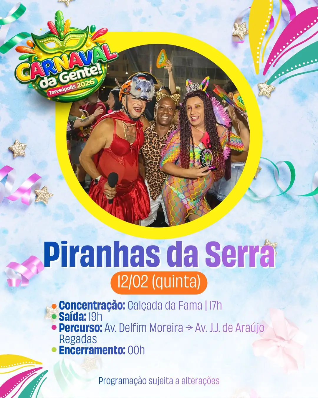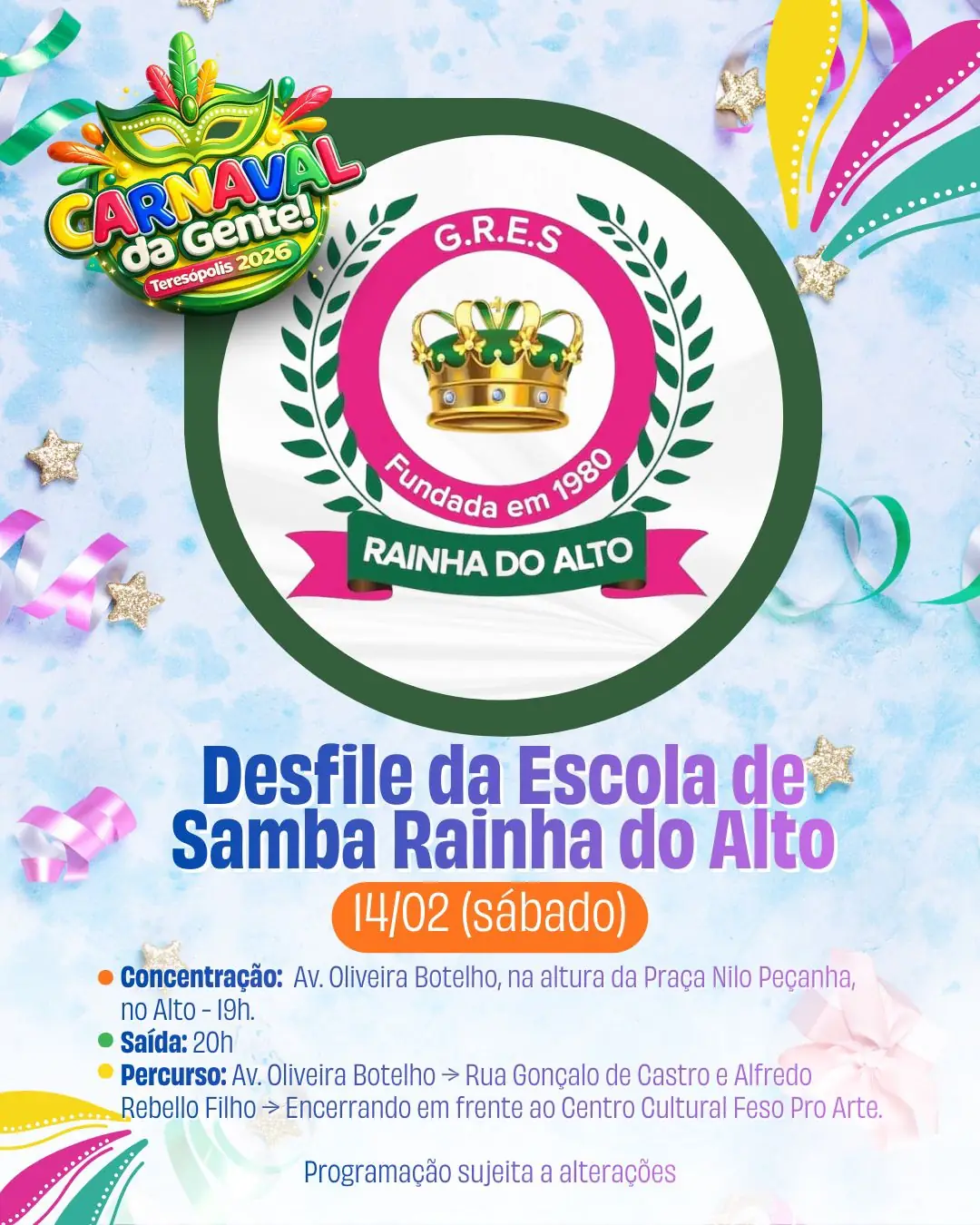 Serão cinco dias de programação intensa, distribuída por importantes espaços do município. As atrações acontecem na Feirinha do Alto (Praça Higino da Silveira), na Praça Olímpica Luís de Camões, na Várzea; na Praça Nilo Peçanha, no Alto, ao lado do Colégio Ginda Bloch; e também no interior, em Bonsucesso, no 3º Distrito. Com shows de artistas locais e desfiles de blocos que prometem colorir ruas e avenidas, o Carnaval teresopolitano reforça sua vocação como uma festa democrática, segura e repleta de energia positiva.