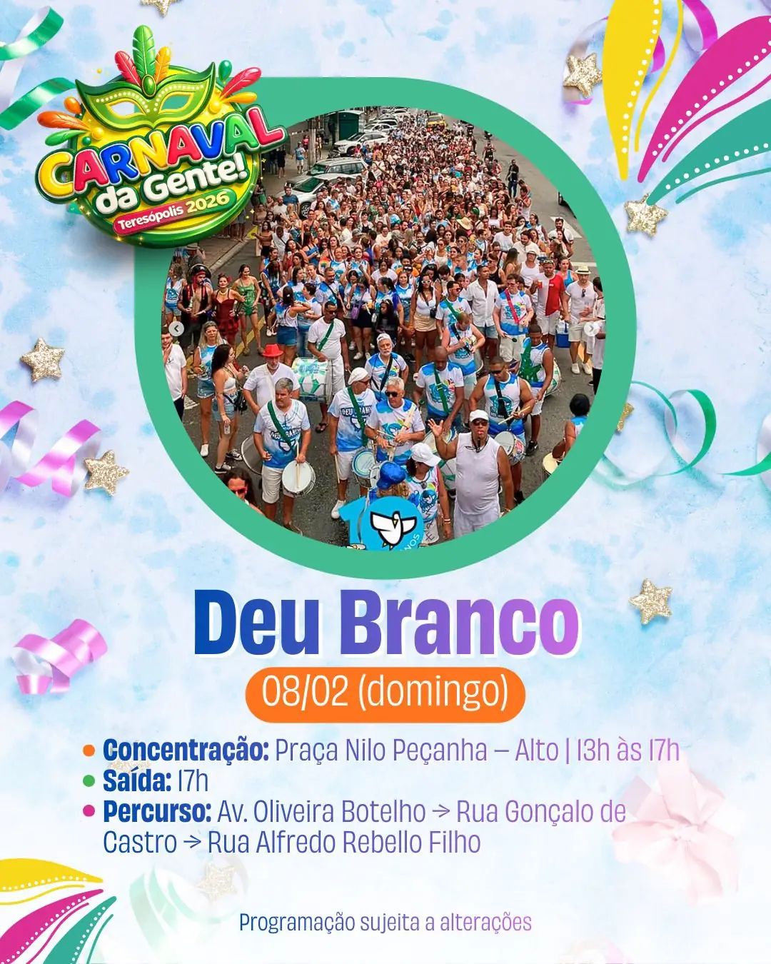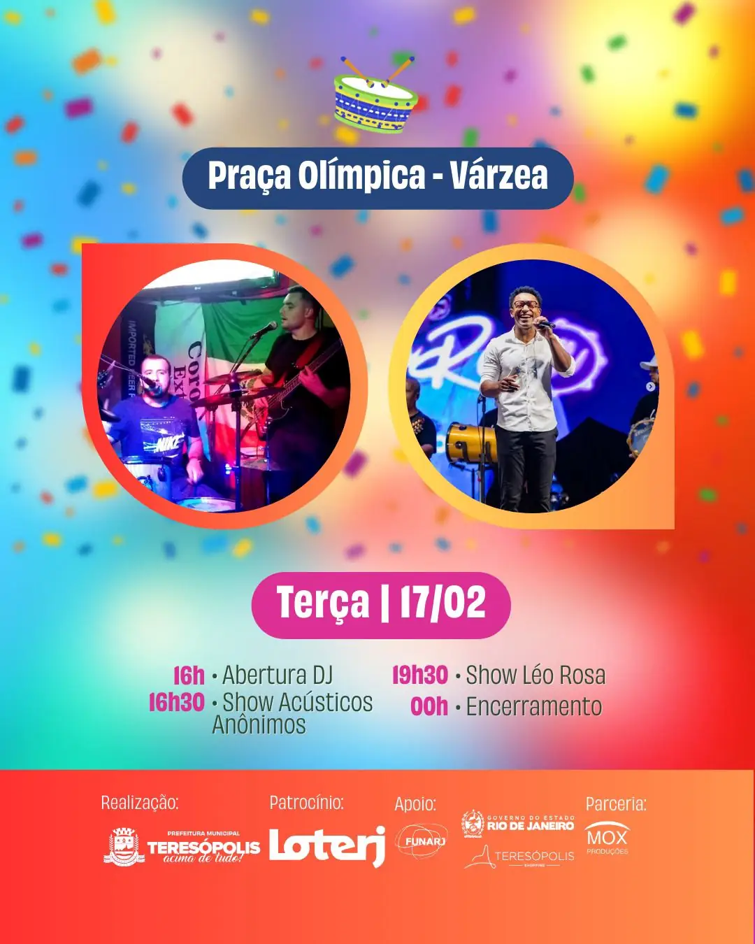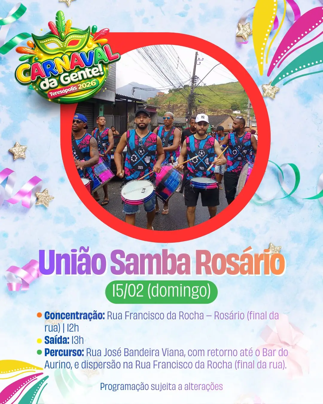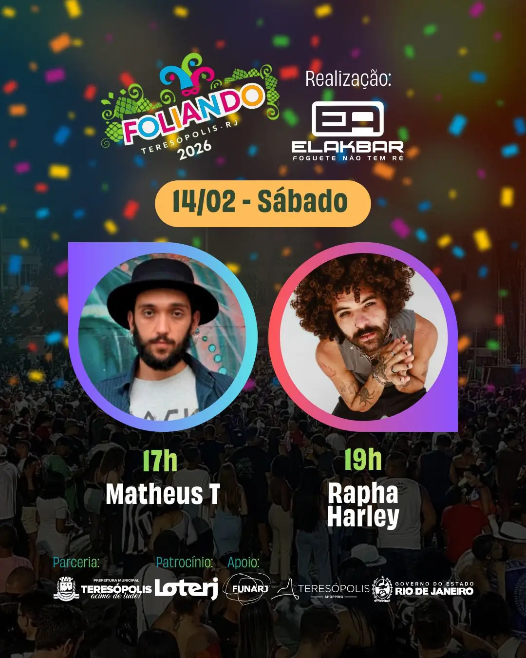 Serão cinco dias de programação intensa, distribuída por importantes espaços do município. As atrações acontecem na Feirinha do Alto (Praça Higino da Silveira), na Praça Olímpica Luís de Camões, na Várzea; na Praça Nilo Peçanha, no Alto, ao lado do Colégio Ginda Bloch; e também no interior, em Bonsucesso, no 3º Distrito. Com shows de artistas locais e desfiles de blocos que prometem colorir ruas e avenidas, o Carnaval teresopolitano reforça sua vocação como uma festa democrática, segura e repleta de energia positiva.