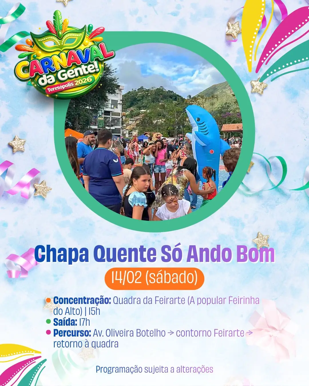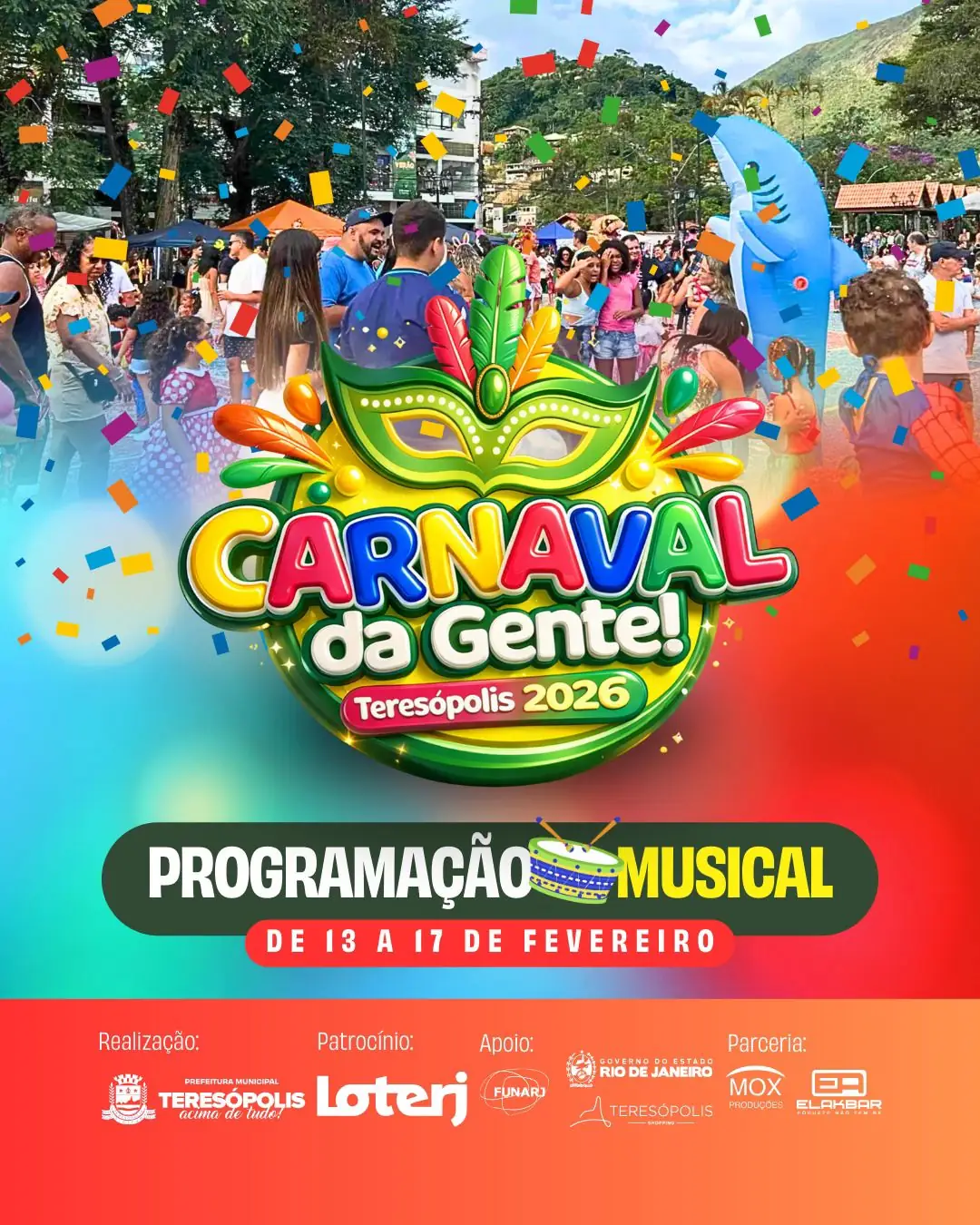 A Prefeitura de Teresópolis divulgou a programação oficial do ‘Teresópolis: O Carnaval da Gente 2026’, que será realizado entre os dias 13 e 17 de fevereiro, prometendo transformar a cidade em um grande palco de alegria, música e celebração coletiva. Com uma proposta voltada para toda a família, a festa reúne blocos tradicionais, apresentações musicais e atividades pensadas para públicos de todas as idades, das crianças aos foliões mais experientes.