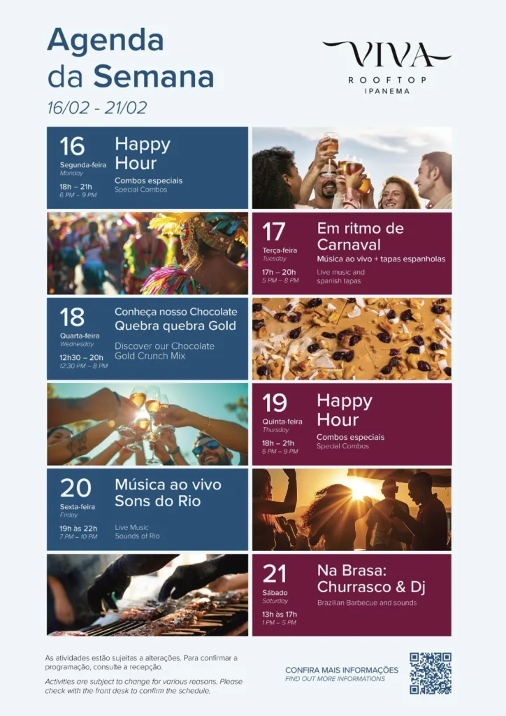 O CDesign Hotel preparou um pacote especial de Carnaval de 13 a 17 de fevereiro, com hospedagem, gastronomia e programação para toda a família. A abertura, na sexta (13), terá Esquenta de Carnaval na Noite Carioca, no Restaurante Nalu, com buffet de petiscos e show de Márlon Santi, além de atividades infantis. No sábado (14), a programação inclui After na varanda, das 16h às 19h, e Sunset no Rooftop, das 16h às 18h, com DJ Azukrie, além da tradicional Feijoada de Carnaval, das 12h às 16h, com bebidas inclusas, pagode do Cezinha e participação da Mangueira. No domingo (15), o Sunset no Rooftop, das 15h às 17h, terá show de Alyne Mello e agenda kids ao longo do dia. Na segunda (16), o DJ Azukrie retorna ao rooftop, das 15h às 17h, e o Bailinho Kids anima os pequenos. O encerramento, na terça (17), contará com gincanas e desfile infantil, reforçando a proposta de um Carnaval animado e à beira-mar para todas as idades.