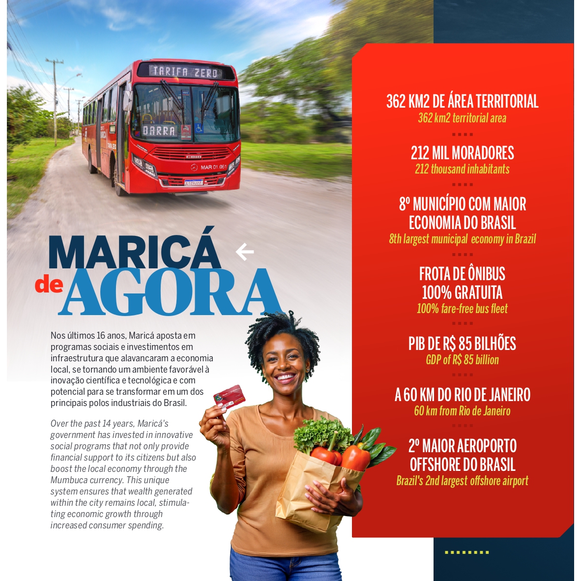 Maricá busca destacar o impacto das políticas públicas implementadas desde 2008, como o transporte público gratuito e a Moeda Social Mumbuca, que incentivam o consumo local e promovem inclusão social. Essas iniciativas ajudaram a cidade a alcançar o posto de oitava maior economia do Brasil, com um Produto Interno Bruto (PIB) de R$ 85 bilhões.